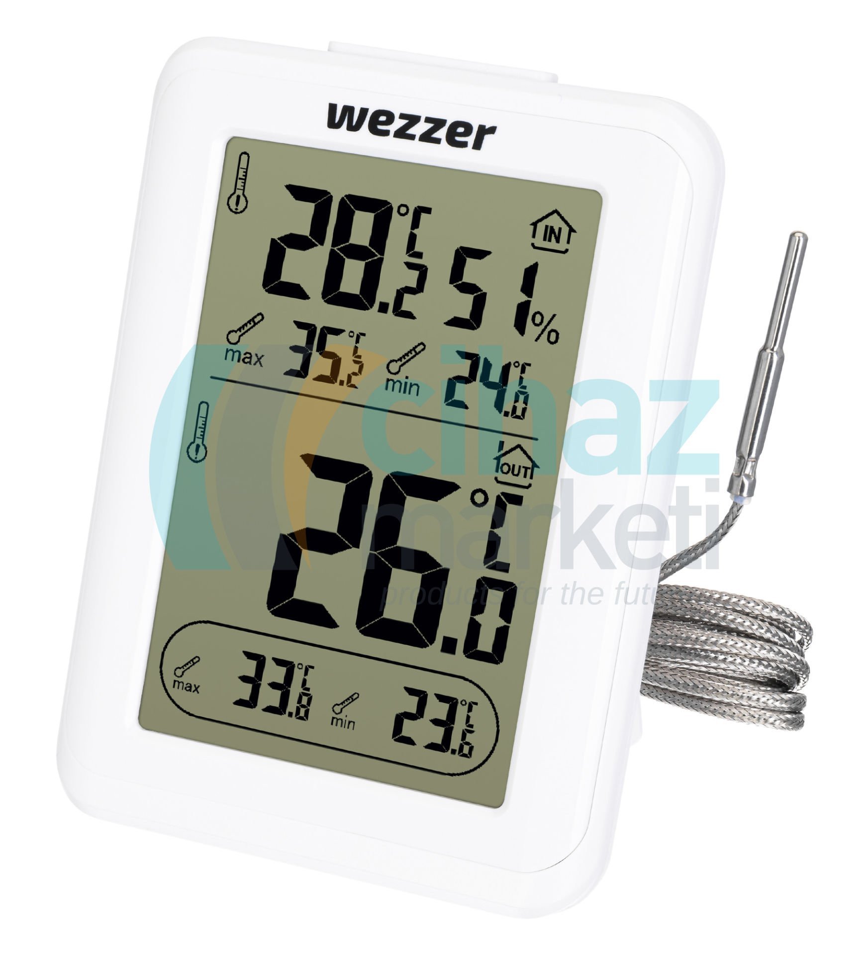 Ekranın üst kısmında ana üniteden gelen okumaları görebilirsiniz, alt kısımda ise termoprobdan gelen ölçümler bulunur. Mevcut sıcaklığa ek olarak, her iki ünite de minimum ve maksimum değerleri gösterir. Ayrıca ana ünite havadaki nem seviyesini ölçer.