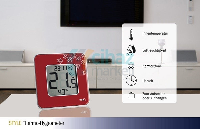 STYLE termo-higrometrenin ayrıca bir saati vardır. Dekoratif tasarımdaki parlak yüzey, bu kullanışlı cihazın aynı zamanda güzel bir ev aksesuarı olmasını sağlar.