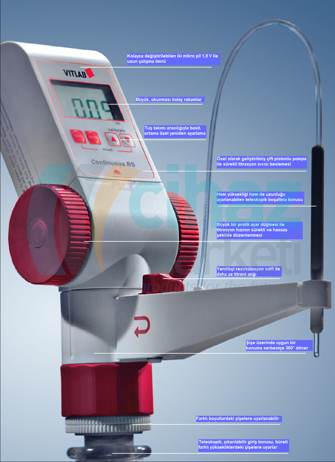 Büret Continuous; Titrasyon işlemi esnasında, Büret otomatik olarak şişeden haznesine doldurur aynı anda da boşaltım yapar ve zaman kaybetmeden sıvıyı yeniden haznesine doldurur. Büret Continuous ekonomiktir ve özellikle kısmi hacimlerdeki hata payı DIN, EN, ISO 8655 -3 normuna uygundur.